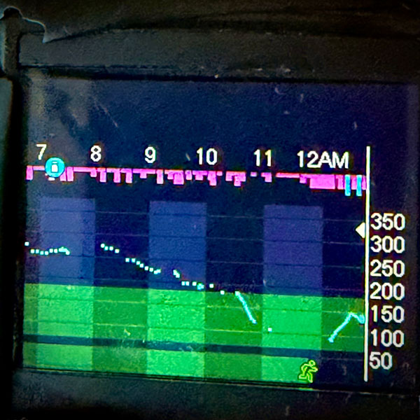 My continuous glucose sensor was intermittently dropping connection—a quirk I’ve noticed with the newer model of sensors. To avoid overcorrection and the risk of going low in later miles, I chose minor manual adjustments based on recent readings rather than letting the pump fully auto-adjust whenever the signal cut out.